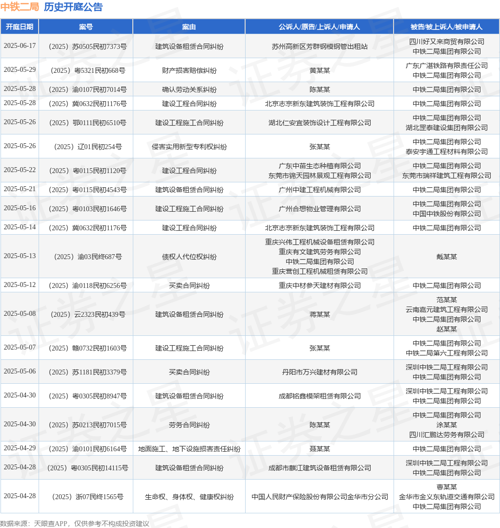 本站消息,根据天眼查APP显示,近日公布了一则中铁二局集团有限公司作为被告/被上诉人的开庭公告,详细内容如下: